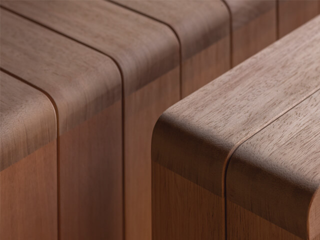 熟練した職人のかんなの技術と、裁断、張り込み作業が、緻密な計算のもとに行われて生まれた優美なアールの形状。触れた瞬間に体に馴染んでくれます。