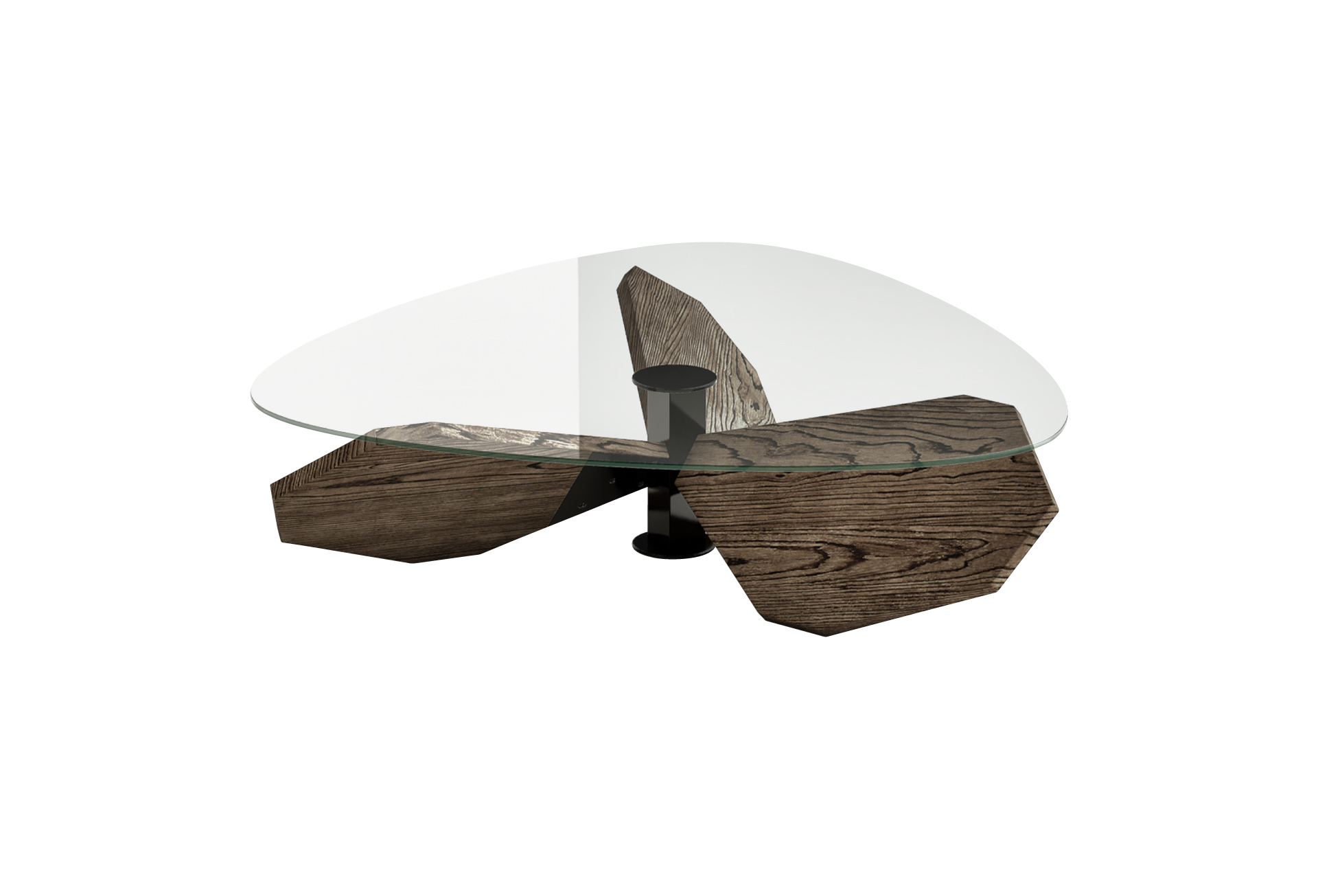 大型船のスクリューをモチーフにしたデザインが印象的な、ガラスのローテーブル。無垢材の風合いを存分に楽しめる、安定感あるつくり。