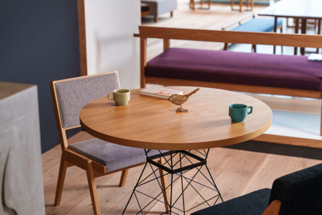 船のスクリューをモチーフに、多角形で作られた構造が印象的な screw。 独特な角度で切出されたパーツを組み合わせ唯一無二の彫刻のような立体感が生まれています。 無垢をふんだんに仕様し、木の個性を存分に楽しめる、見た目にもインパクトがあるデザインです。 テーブルは3本脚でしっかりと床を支持するのでガタツキはゼロ。機能的にもとても優れています。