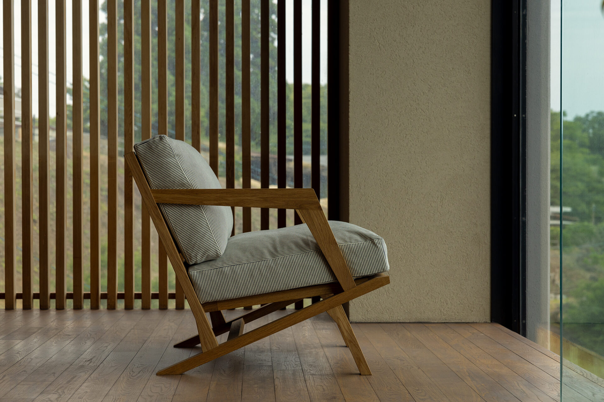 三角形のパーツが作る印象的なデザイン 背と座を支える三角形のフレームが特徴の「Cabin」。ホテルの客室やレストランなどで使用されるアームチェアとしてデザインしました。窓辺や読書コーナー、ティータイムのチェアとしておすすめです。 デザインに…
